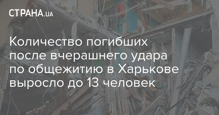 Число погибших из-за вчерашнего удара по общежитию в Салтовском районе выросло до 13 человек, сообщил представитель Харьковской областной прокуратуры Дмитрий Чубенко.