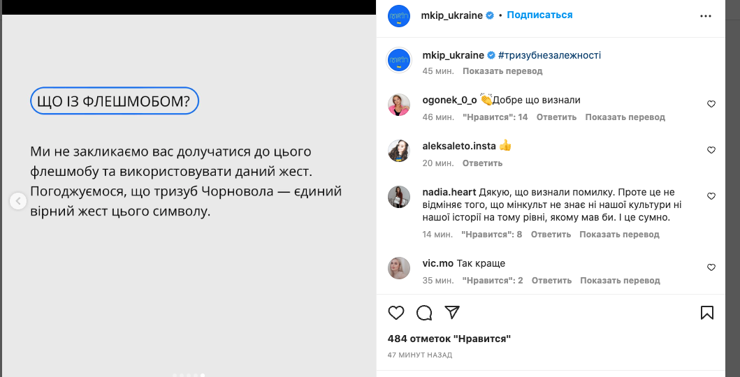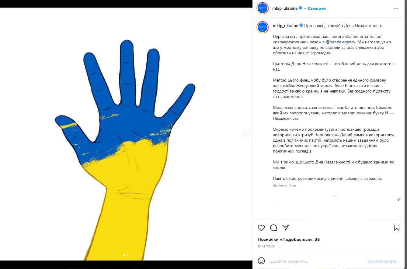 При том сначала они выложили пост, в котором заявили, что "жест Черновола" использует одна политическая партия, а жест ко Дню независимости хотели сделать приемлемым для всех украинцев.