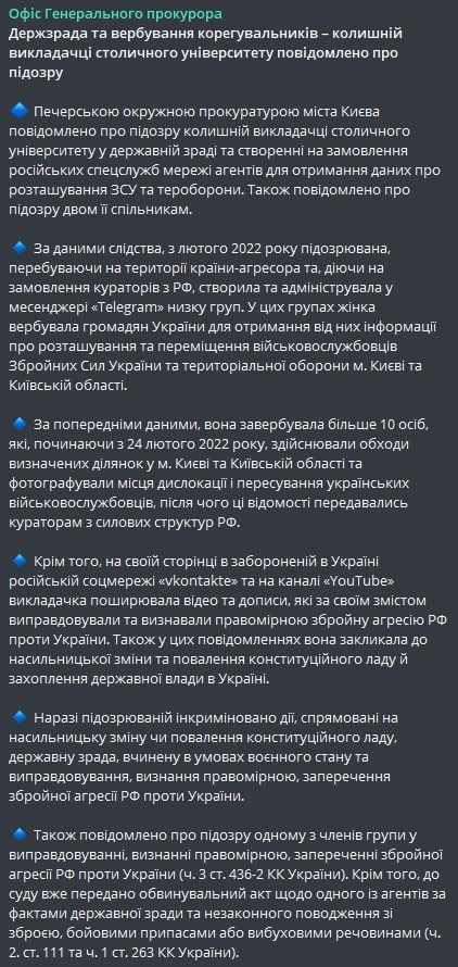 Экс-преподавательницу университета им. Драгоманова в Киеве подозревают в госизмене. Ее обвиняют в создании сети агентов для получения данных о расположении ВСУ и теробороны в Киеве.