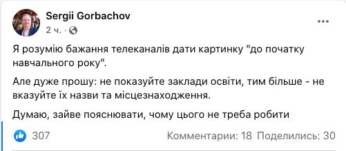 "Я понимаю желание телеканалов дать картинку "к началу учебного года". Но очень прошу: не показывайте учебные заведения, тем более – не указывайте их названия и местонахождение. Думаю, лишнее объяснять, почему этого не нужно делать", - написал Горбачев в Facebook.