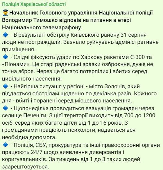 "Следователи фиксируют удары по Харькову ракетами С-300 и "Пионами". Это старые советские образцы вооружения, очень не точное оружие. Из-за этого много потерпевших и убитых среди мирного населения", - пишет Тимошко.