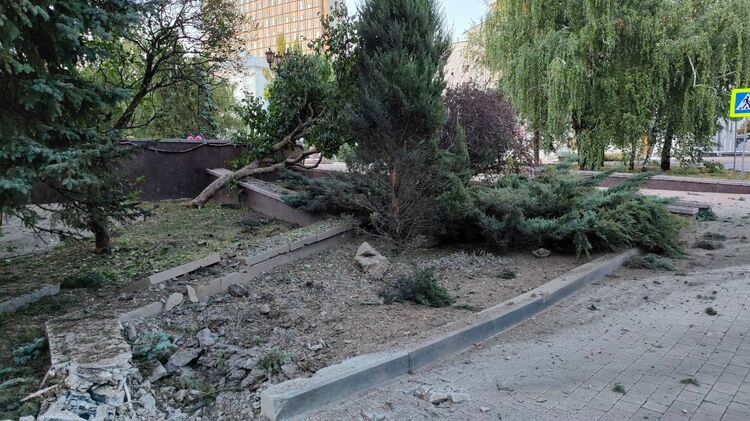 На фото можно заметить разрушения пешеходной зоны рядом с памятником Пушкину позади Драмтеатра. В соседних домах выбиты стекла.