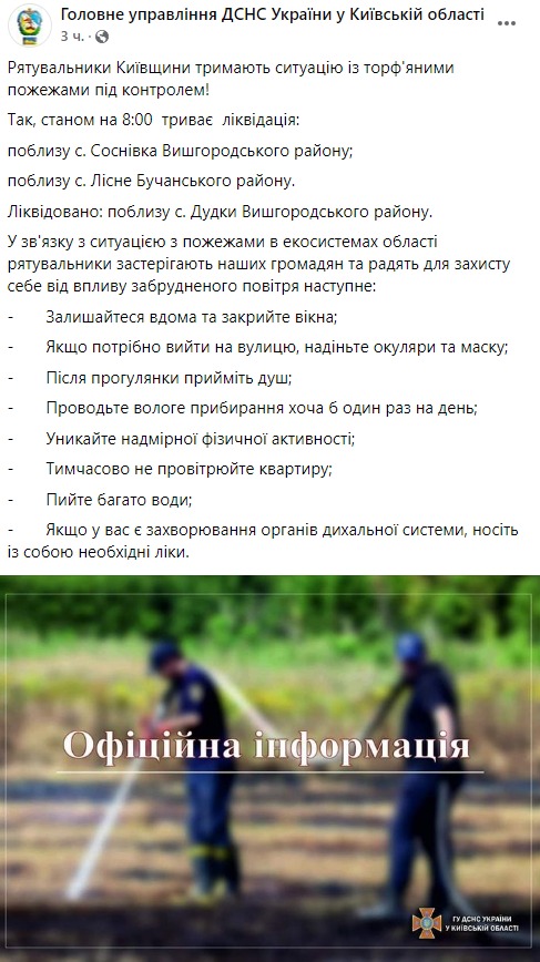 В Киевской области продолжают тушить горящие торфяники, поэтому часть населенных пунктов еще страдают от дыма.