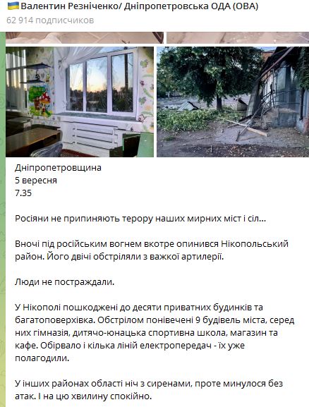 Ночью 5 сентября под российским огнем в очередной раз оказался Никопольский район Днепропетровской области. Его дважды обстреляли из тяжелой артиллерии.
