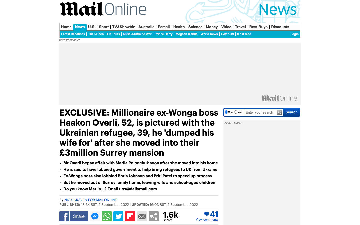 Бывший глава кредитной компании Wonga Хокон Оверли завязал отношения с 39-летней украинкой Марией Полончук в начале этого года вскоре после ее переезда в его дом в Суррее за три миллиона фунтов.