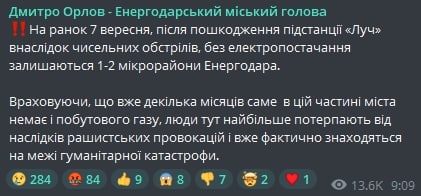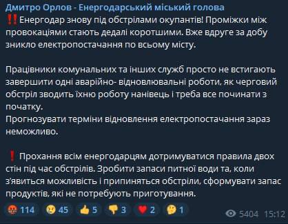 11.00 Энергодар снова без света. Из-за повреждения подстанции "Луч" 1-2 микрорайона города обесточены, сообщил мэр Дмитрий Орлов.