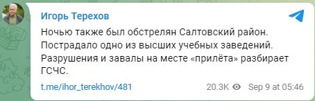 "Ночью также был обстрелян Салтовский район. Пострадало одно из высших учебных заведений. Разрушения и завалы на месте "прилёта" разбирает ГСЧС" - сообщил он утром в Телеграм-канале.