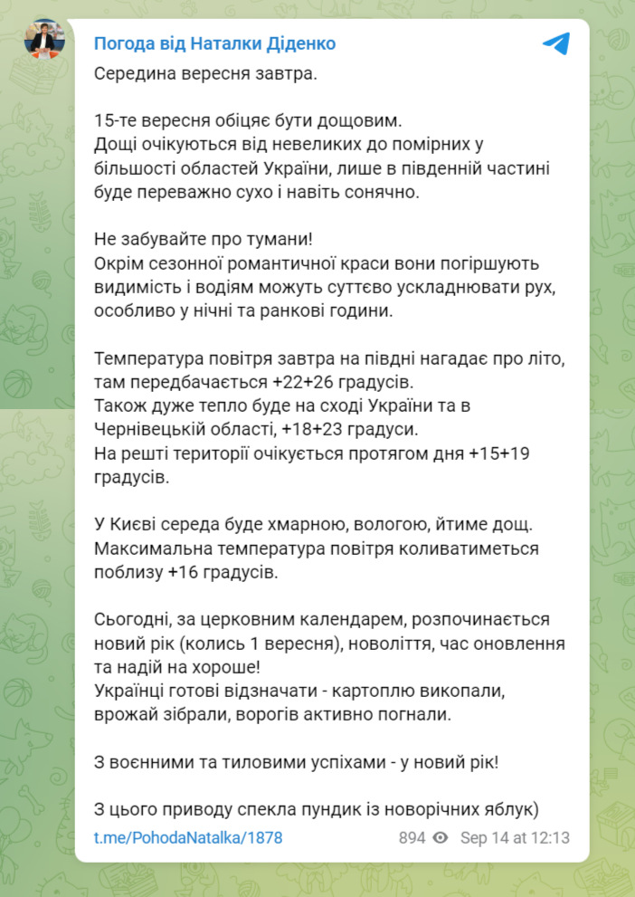 "Сегодня, по церковному календарю, начинается новый год, новолетие, время обновления и надежд на хорошее! Украинцы готовы отмечать – картошку выкопали, урожай собрали, врагов активно погнали. С военными и тыловыми успехами – в новый год!", - добавила Диденко.