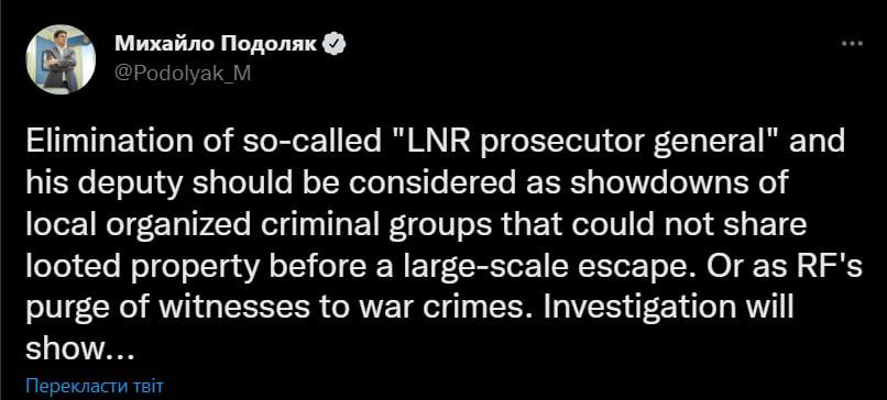 "Ликвидацию так называемого "генпрокурора ЛНР" и его заместителя в собственном кабинете следует рассматривать не иначе как разборки местных уголовных ОПГ, не разделивших награбленное имущество накануне масштабного бегства. Другая версия – зачистка РФ свидетелей военных преступлений. Следствие покажет", - написал Подоляк в Twitter.