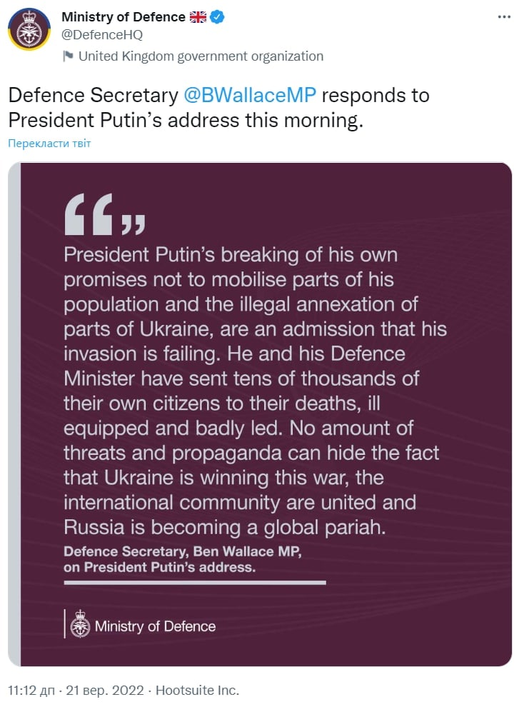 Министр обороны Великобритании Бен Уоллес отреагировал на решение президента РФ Владимира Путина о частичной мобилизации.