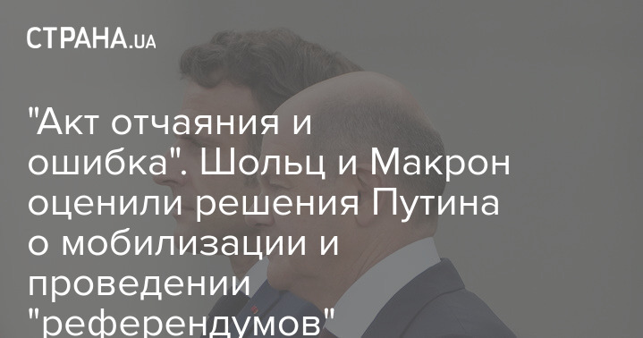 Канцлер Германии Олаф Шольц назвал решения президента РФ Владимира Путина о мобилизации и о проведении "референдумов" на оккупированных территориях Украины "актом отчаяния". Президент Франции назвал их "ошибкой".