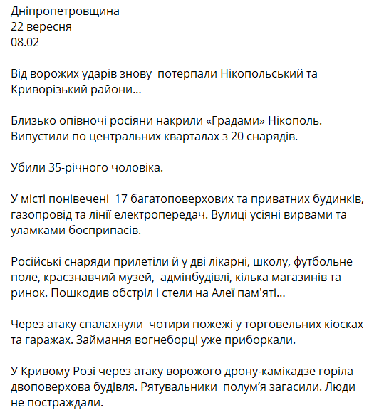 Ночью с 21 на 22 сентября войска РФ нанесли удары по Никопольскому и Криворожскому районам Днепропетровской области. В результате в Никополе погиб местный житель.
