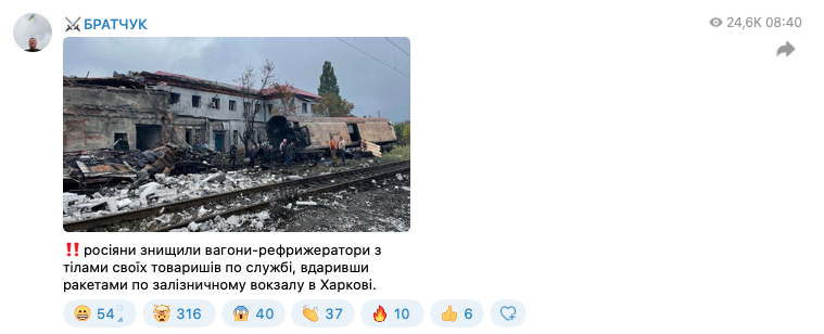 Спикер Одесской ОВА Сергей Братчук заявил, что вчерашним ударом по железной дороге в Харькове РФ уничтожила вагоны-рефрижераторы с телами российских военных.