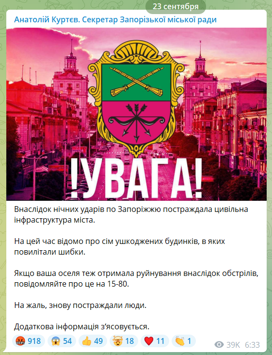 В ночь с 22 на 23 сентября российские войска нанесли удары по Запорожью. Пострадала гражданская инфраструктура.