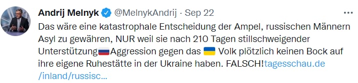 "Это было бы катастрофическим решением правительственной коалиции – предоставить убежище российским мужчинам только потому, что они через 210 дней молчаливой поддержки российской агрессии против украинского народа вдруг не горят желанием получить своё собственное место упокоения в Украине. Неправильно!", - говорится написал украинский дипломат.