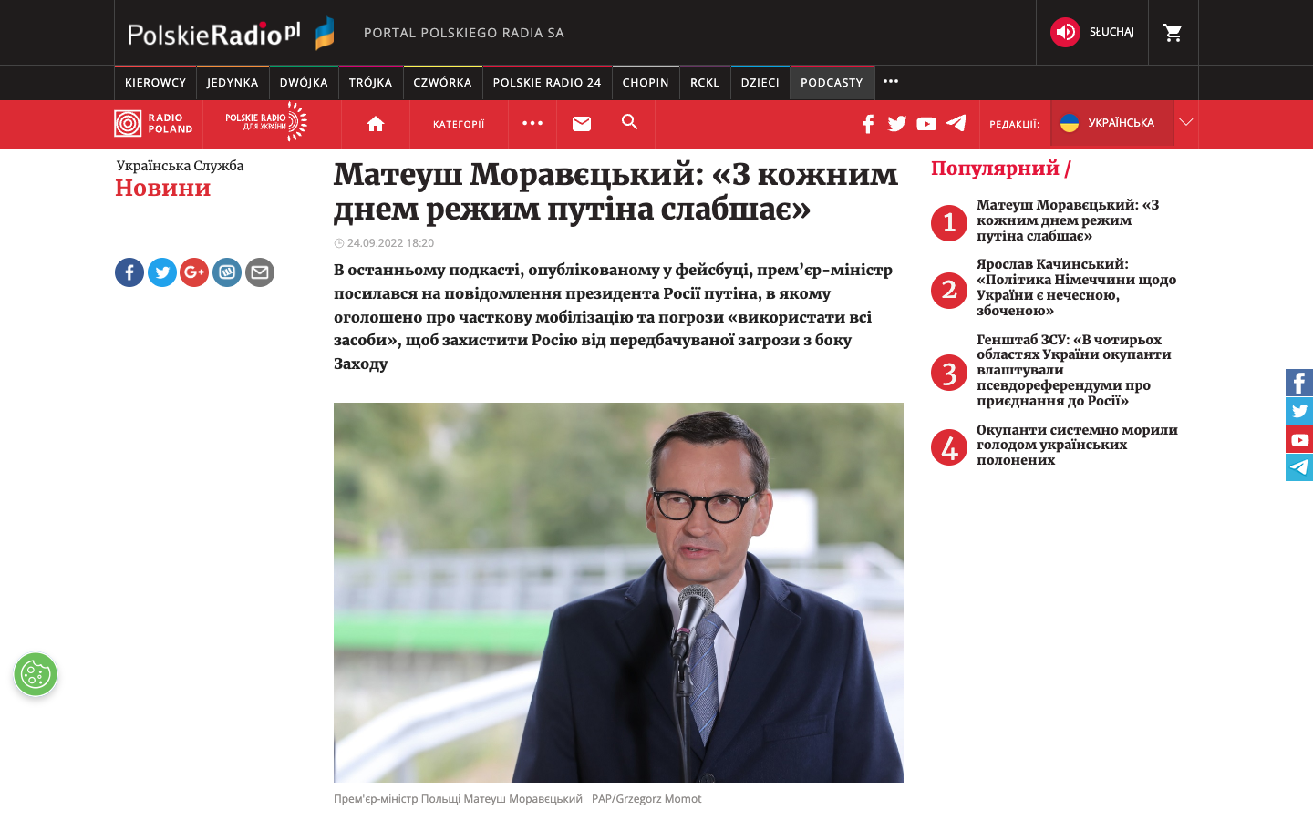 "Тем более потрясающая реакция российского общества на новость о призыве. Буквально после выступления Путина российский интернет захлестнула волна вопросов о том, как избежать призыва в армию, а в поисковике Google воцарились запросы: как сломать руку или как покинуть Россию", - отметил Моравецкий.