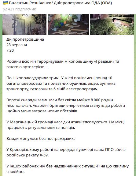 В Днепропетровской области ночью 28 сентября военные РФ трижды обстреляли Никополь. Пострадали и другие громады области.