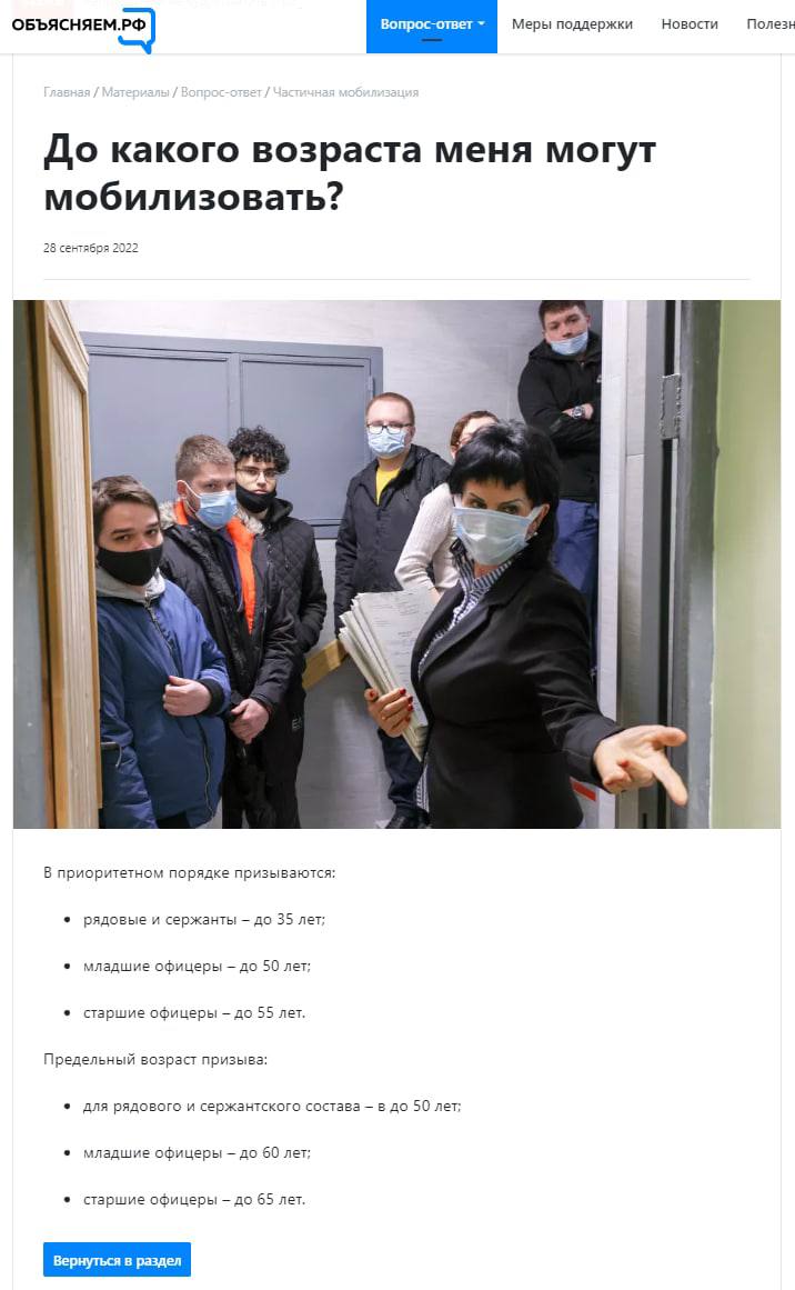 "Предельный возраст подпадающих под частичную мобилизацию рядовых и сержантов - 50 лет, младших офицеров - 60 лет", - сказано в сообщении.
