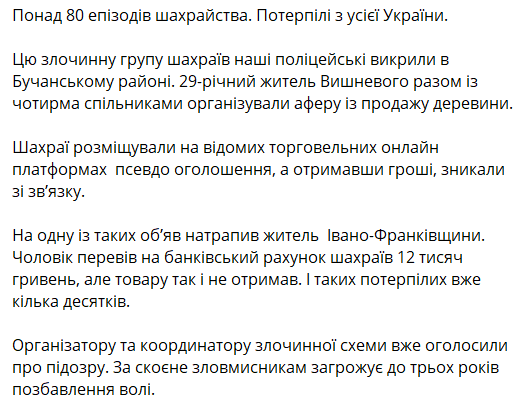 "Эту преступную группу мошенников полицейские разоблачили в Бучанском районе. 29-летний житель Вишневого вместе с четырьмя сообщниками организовали аферу по продаже древесины", - рассказал он, добавив, что на их счету 80 случаев мошенничества.