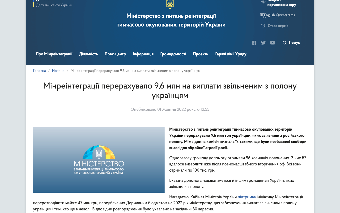 Минреинтеграции выплатило по 100 тысяч гривен разовой помощи 96 бывшим украинским военнопленным, большинство из которых были освобождены после 24 февраля.
