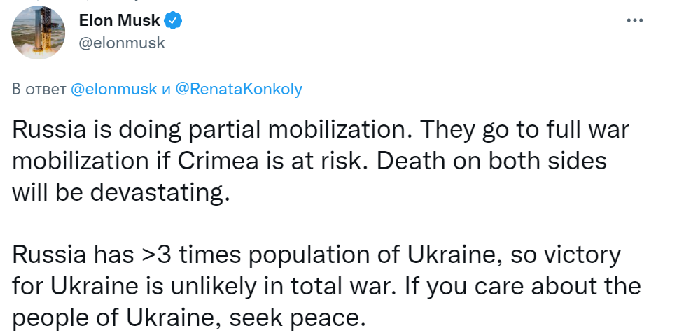 "Россия проводит частичную мобилизацию. Они пойдут на полную военную мобилизацию, если Крым окажется в опасности. Смерть с обеих сторон будет разрушительной. Россия имеет втрое больше населения, чем Украина, поэтому победа Украины в тотальной войне маловероятна. Если вы заботитесь о народе Украины, ищите мира", - написал Илон Маск, закрепив этот пост на своей странице в Твиттере.
