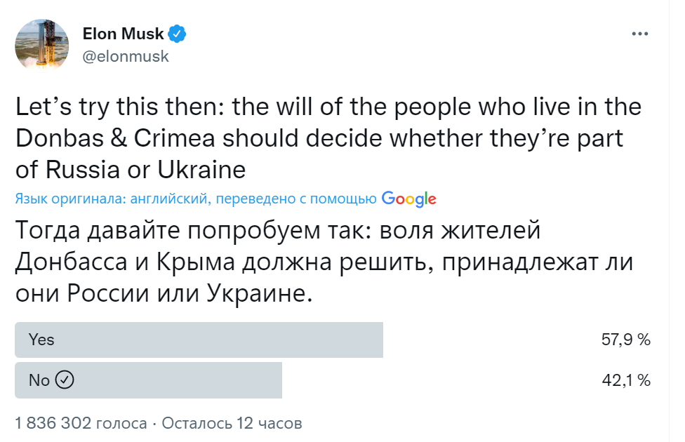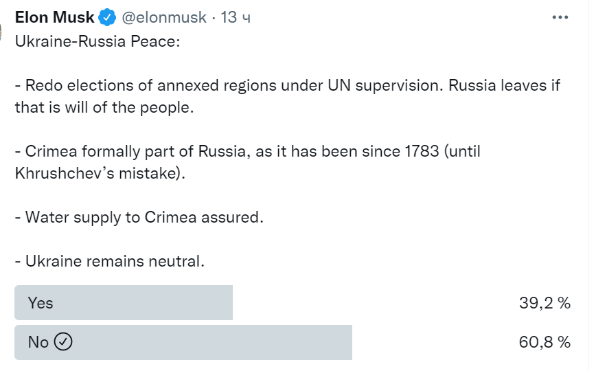 Другое дело, что авторитет Илона Маска в мире весьма высок, причем среди массовой аудитории он будет намного выше, чем у отставных политиков вроде Киссинджера. И, пожалуй, впервые предложение оставить Крым за Россией (а гипотетически - и другие захваченные территории) прозвучало от одного из лидеров мировой "глобальной повестки", которого точно нельзя отнести к "агентам Кремля".