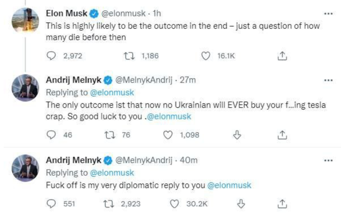 Вскоре к дискуссии подтянулся уходящий с поста посла Украины в Германии Андрей Мельник. Он высказал свое мнение Маску нецензурно, как это он часто практикует.