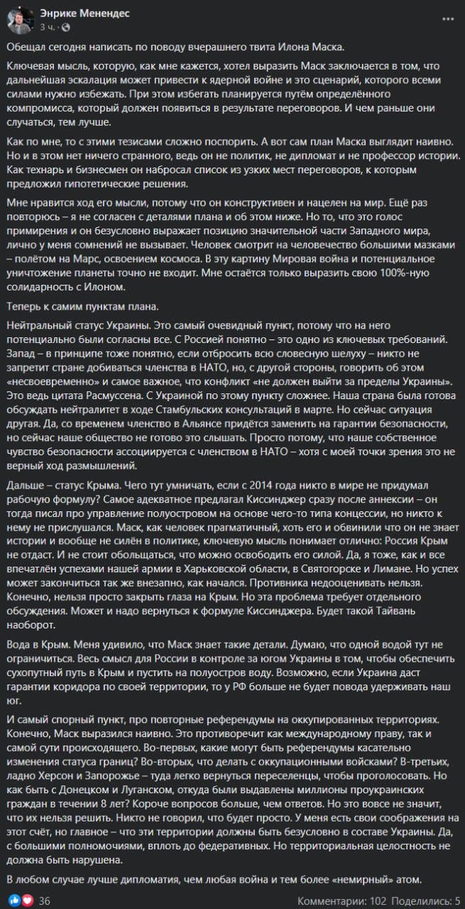 "Я не согласен с деталями плана. Но то, что это голос примирения и он безусловно выражает позицию значительной части Западного мира, лично у меня сомнений не вызывает. Человек смотрит на человечество большими мазками – полётом на Марс, освоением космоса. В эту картину Мировая война и потенциальное уничтожение планеты точно не входит. Мне остаётся только выразить свою 100%-ную солидарность с Илоном", - написал Менендес.