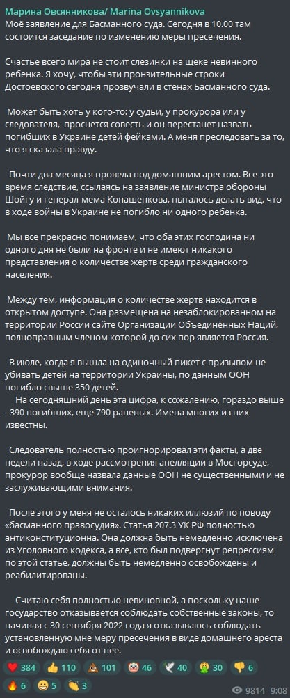 "Считаю себя полностью невиновной, а поскольку наше государство отказывается соблюдать собственные законы, то начиная с 30 сентября 2022 года я отказываюсь соблюдать установленную мне меру пресечения в виде домашнего ареста и освобождаю себя от нее", - делает вывод она.