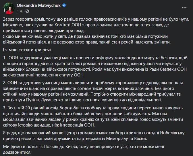"Я рада, что возглавляемый мной Центр гражданских свобод получил сегодня Нобелевскую премию вместе с нашими друзьями и партнерами из "Мемориала" и "Весны", - написала глава центра Александра Матвейчук.