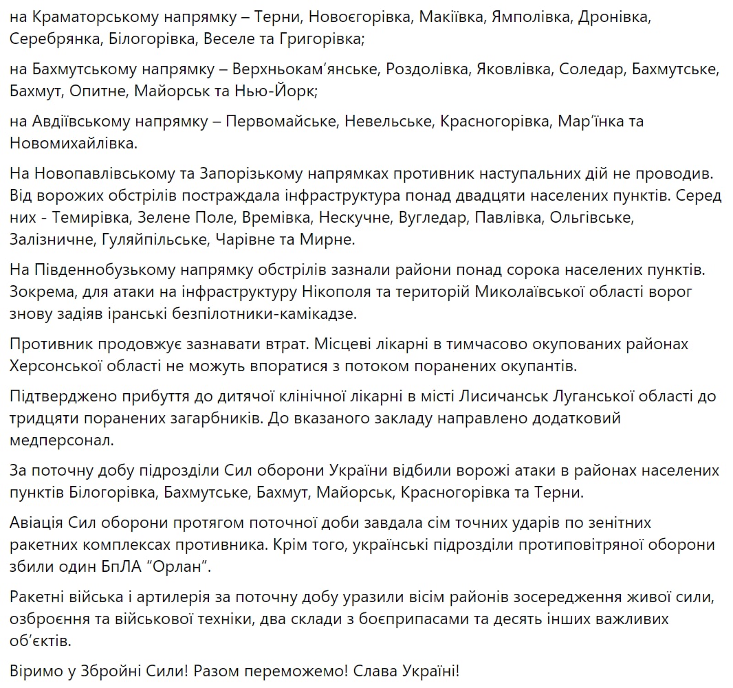 2. Отбиты атаки россиян в Бахмуте, Бахмутском, Выемке, Зайцево (взятие которого декларировала Россия), Красной Горе, Майорске, Озеряновке, Отрадовке, Андреевке, Первомайском, Красногоровке, Веселом, Каменке, Победе, Невельском, Новомихайловке и Терновых Подах.