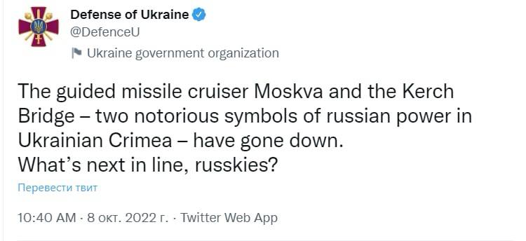 Минобороны Украины сообщило, что "ракетный крейсер "Москва" и Керченский мост — два печально известных символа российской власти в украинском Крыму — исчезли. Что дальше, русские?"