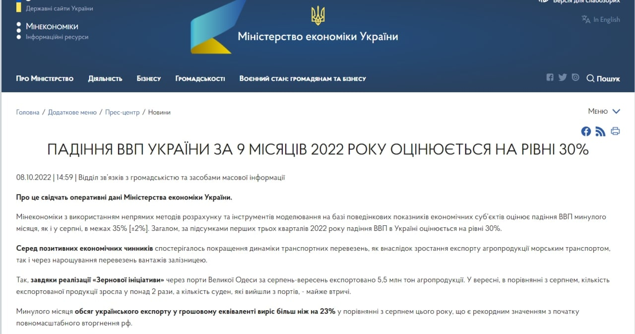 "Минэкономики с использованием косвенных методов расчета и инструментов моделирования на базе поведенческих показателей экономических субъектов оценивает падение ВВП в прошлом месяце, как и в августе, в пределах 35% [±2%]. В целом, по итогам первых трех кварталов 2022 года падение ВВП в Украине оценивается на уровне 30%", — говорится в сообщении.