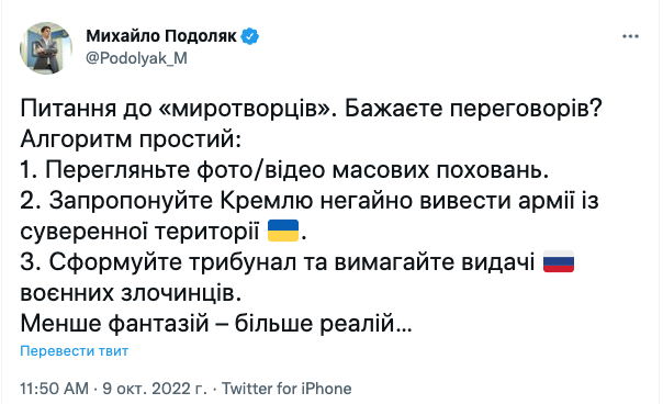 Подоляк потребовал создать трибунал против России, а не рассуждать о мирных переговорах