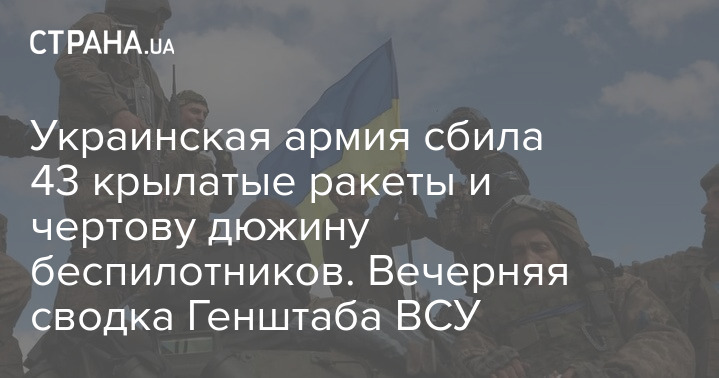 Воздушные силы и ПВО уничтожили 56 воздушных целей: 43 крылатые ракеты и 13 беспилотных летательных аппаратов. Угроза нанесения противником авиационных и ракетных ударов на всей территории Украины сохраняется и дальше.