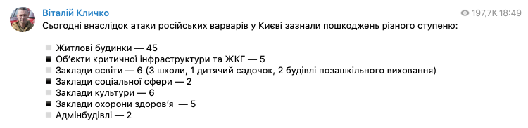 Мэр Киева Виталий Кличко сообщил о поврежденных в результате сегодняшних ударов объектах столицы: