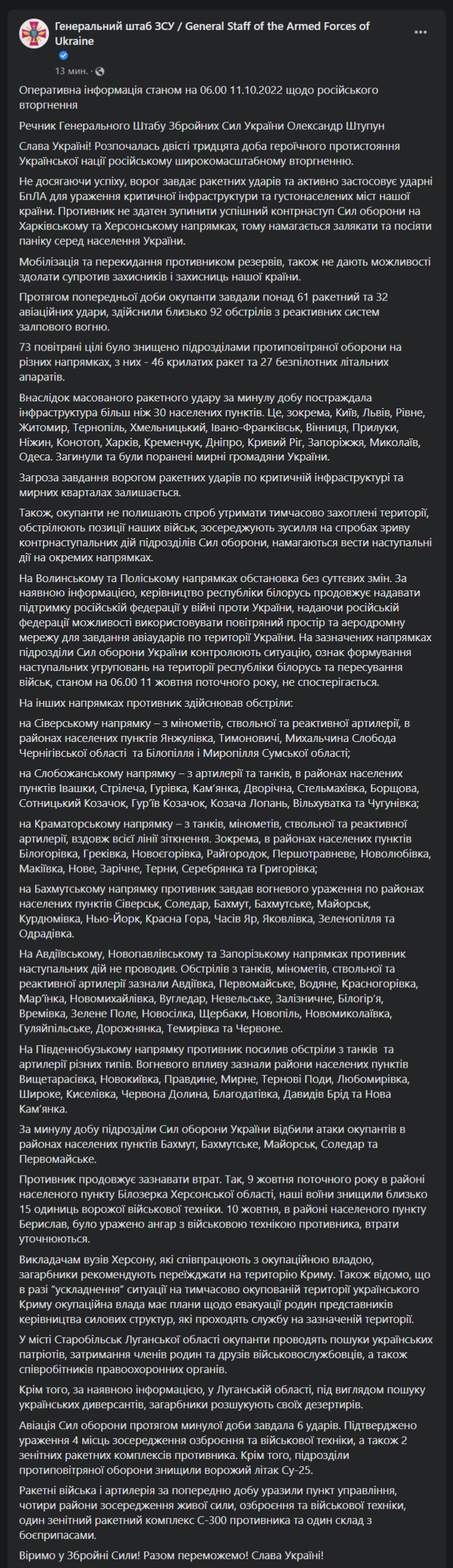 Ранее мы подводили итоги 229-го дня войны с РФ. Россияне массированно ударили ракетами по Киеву и всей Украине, повредив подстанции ТЭС и ТЭЦ. Часть страны осталась без электричества, украинцев предупредили о возможных веерных отключениях света. Лукашенко вчера заявил, что Украина якобы готовилась напасть на Беларусь и что он договорился с Путиным о развертывании совместной региональной группировки войск в стране. На фронте вчера противник наступал на Бахмутском и Авдеевском направлениях.