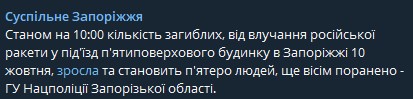 Количество погибших от вчерашнего попадания ракеты в подъезд пятиэтажного дома в Запорожье выросло до пяти человек, еще восемь ранены.