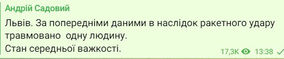В результате сегодняшнего ракетного удара по Львову травмирован один человек.