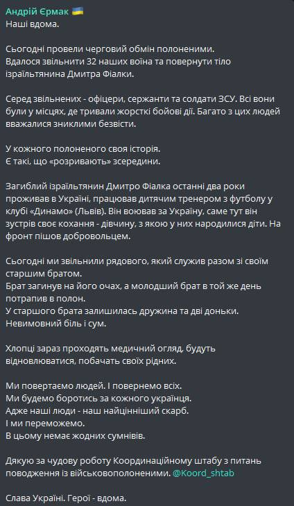 Украина вернула из российского плена еще 32 военных. Фото: t.me/ermaka2022