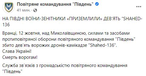 Утром, 12 октября, над Николаевской областью, украинские силы ПВО сбили девять вражеских беспилотников.