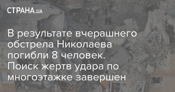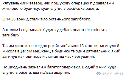 В общей сложности из-под завалов дома деблокированы тела шестерых погибших. Таким образом, в результате российской атаки 13 октября погибли 8 николаевцев: семь жителей дома и один спасатель, погибший на лодочной станции во время дежурства.