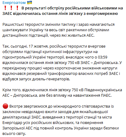 По данным пресс-службы, сегодня, 17 октября, войска РФ в очередной раз обстреляли подстанции критической инфраструктуры на подконтрольной Украине территории, в результате чего в 03:59 отключилась последняя линия связи 750 кВ ЗАЭС - Днепровская.
