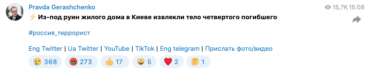 Советник главы МВД Антон Геращенко сообщает о четвёртом погибшем под завалом дома на улице Жилянской в Киеве.