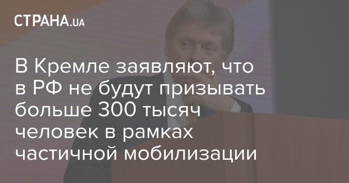 Пресс-секретарь президента РФ Дмитрий Песков заявляет, что больше 300 тысяч человек призывать в рамках частичной мобилизации не будут.
