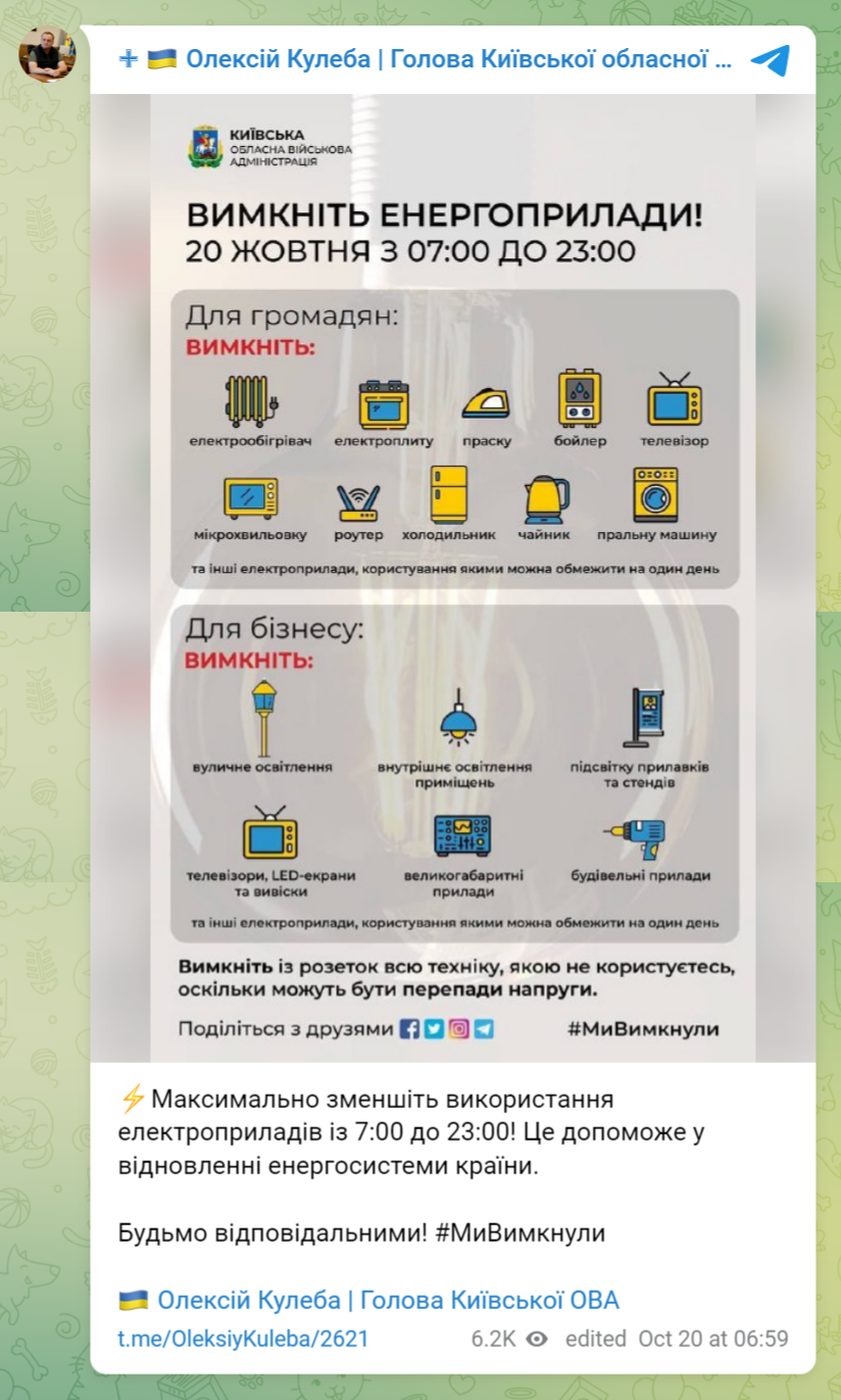 В четверг, 20 октября, в Киевской области призвали максимально ограничить потребление энергии с 07:00 и до 23:00.