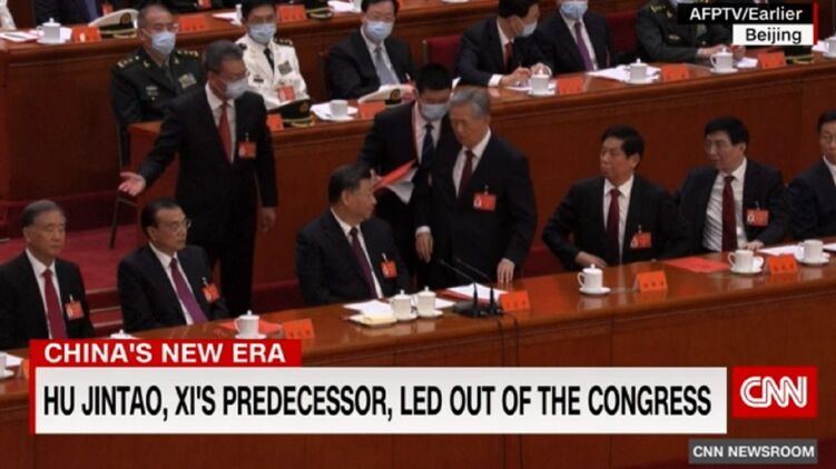 Бывшего китайского лидера Ху Цзиньтао неожиданно вывели из зала на закрытии съезда Коммунистической партии. Скриншот видео CNN
