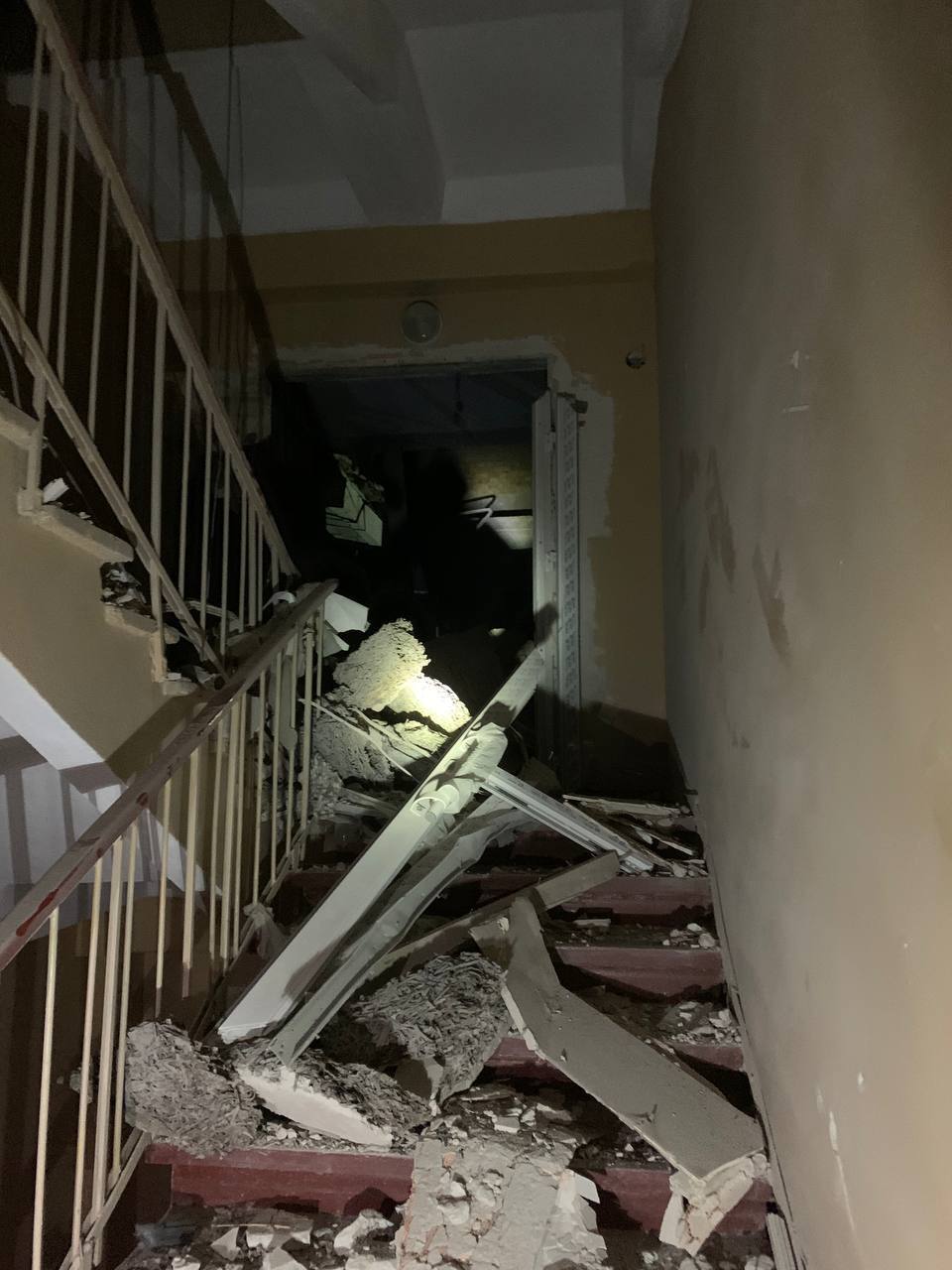 По его данным, повреждения получил и соседний 10-этажный жилой дом. Обломками и взрывной волной в нем вынесло окна, двери, уничтожены балконы.