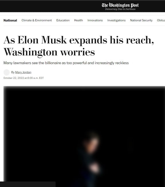 Несмотря на то, что деятельность Маска помогает Америке держать технологическое лидерство в мире, симпатии к нему у руководства США нет. С другой стороны, несмотря на свою колоссальную финансовую независимость, Маск тоже не может вполне игнорировать правительство, которое весьма обеспокоено его акциями, пишет автор статьи Мэри Джордан.