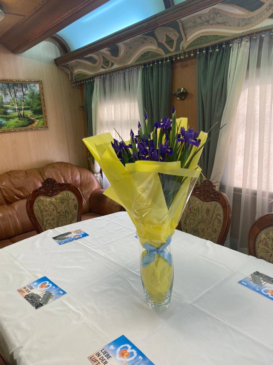 "Концентрация ирисов на фото в купе нашего утреннего дипломатического поезда не случайна: любовь к ирисам у нас общая, что поделаешь", - говорится в сообщении пресс-службы